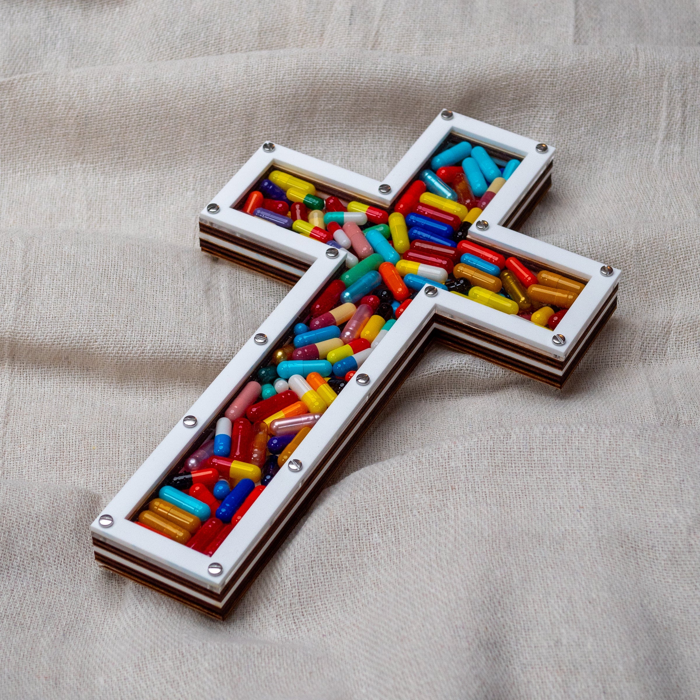 A hand signed sculpture with edition number laser etched on the reverse. White front with assorted pills behind clear perspex, fixed with stainless steel nuts & bolts. A 'D ring' is fixed on the reverse so it's ready to hang. Comes in a dust bag along with a certificate of authenticity and custom cleaning cloth.