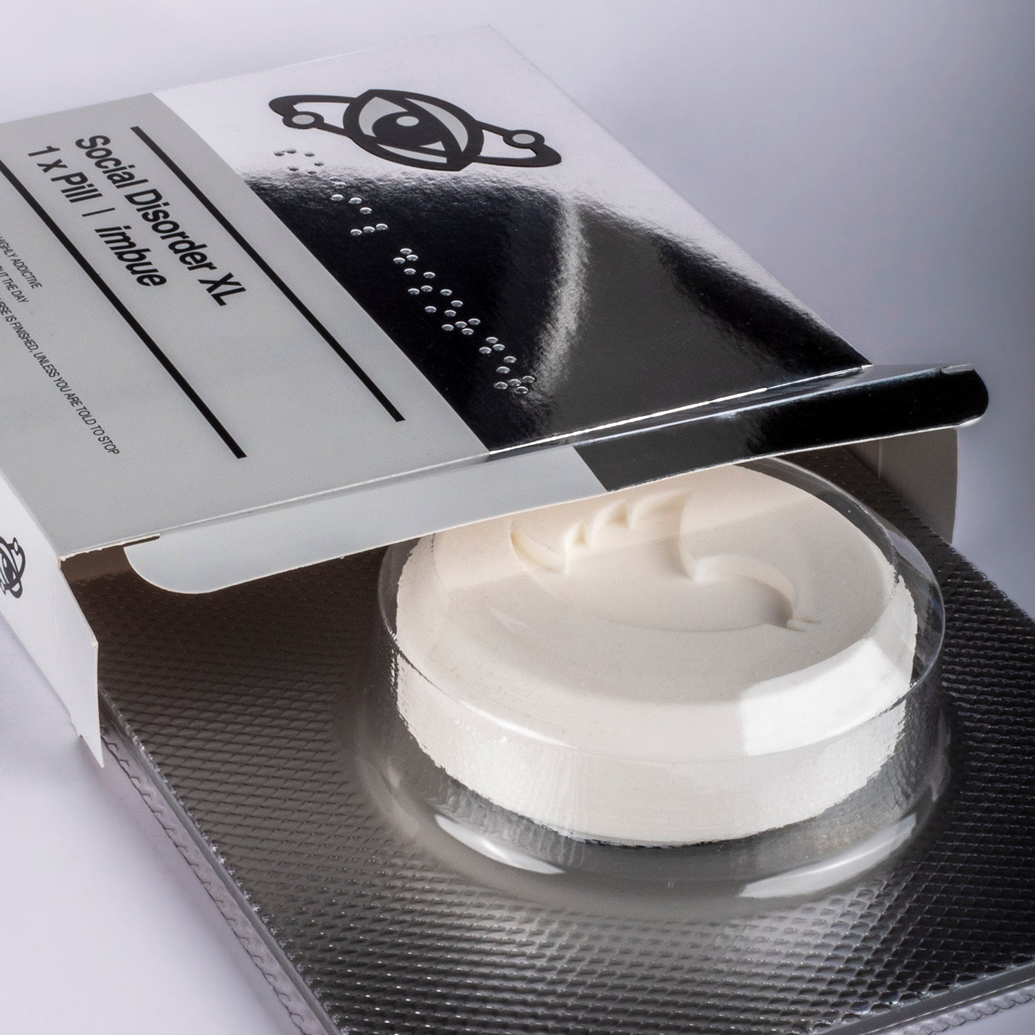 Large cast resin pill in a vacuum formed blister pack with a laser cut, metallic acrylic back. Signed and numbered on the reverse. Each piece comes in a (20 x 20cm) custom printed and embossed box.