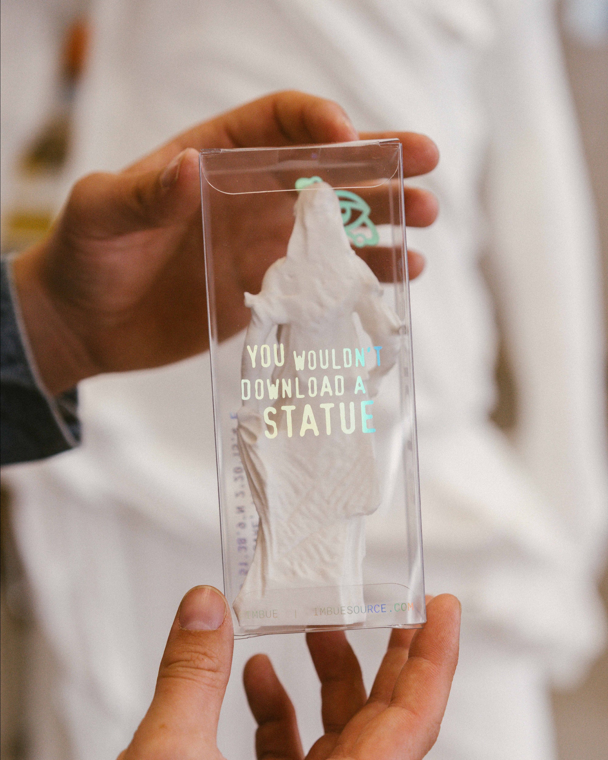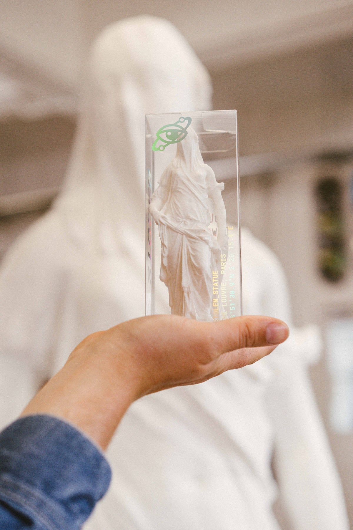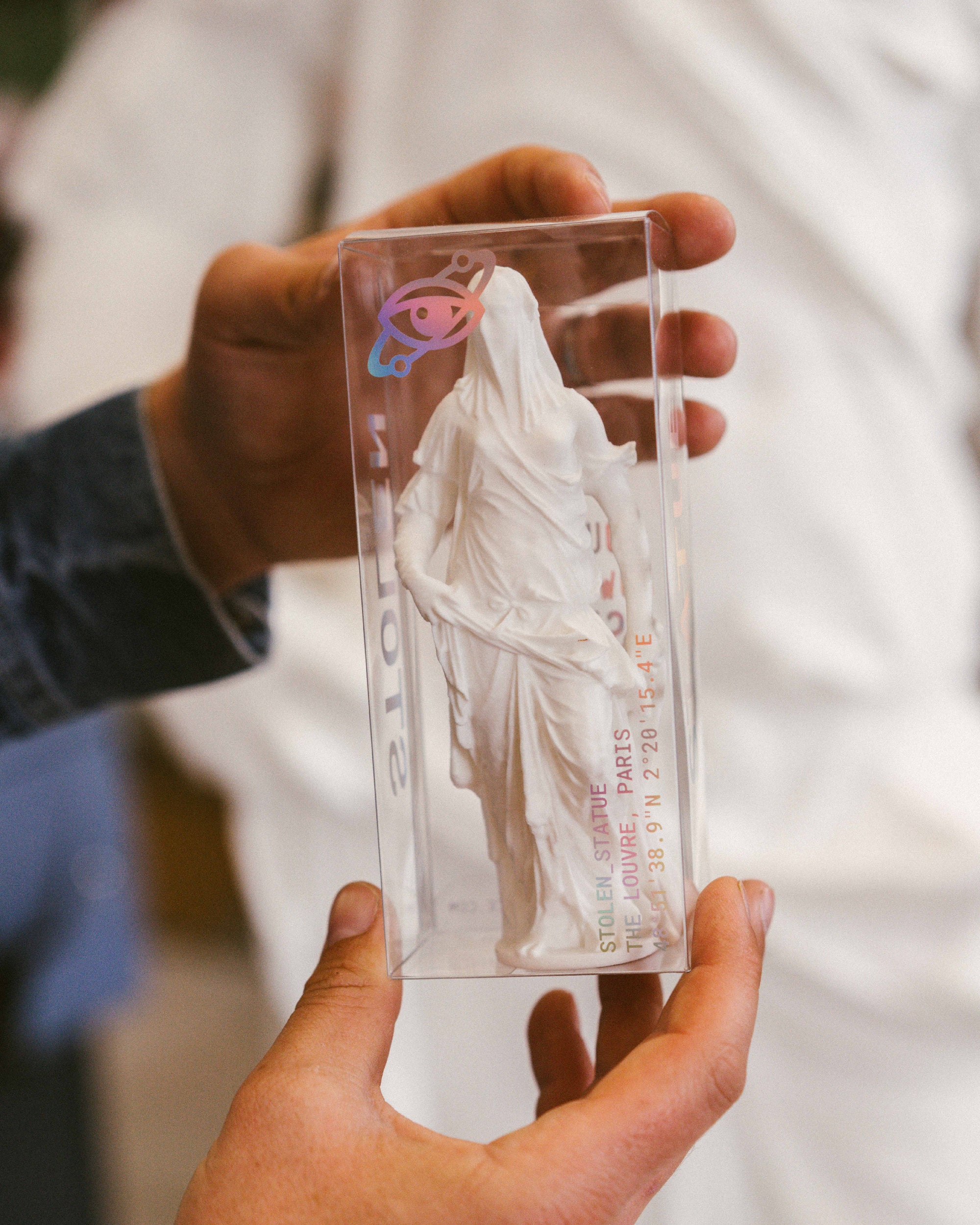 3D print from digital scan at The Louvre. In clear display box with holographic print. Printed live during the exhibition run.